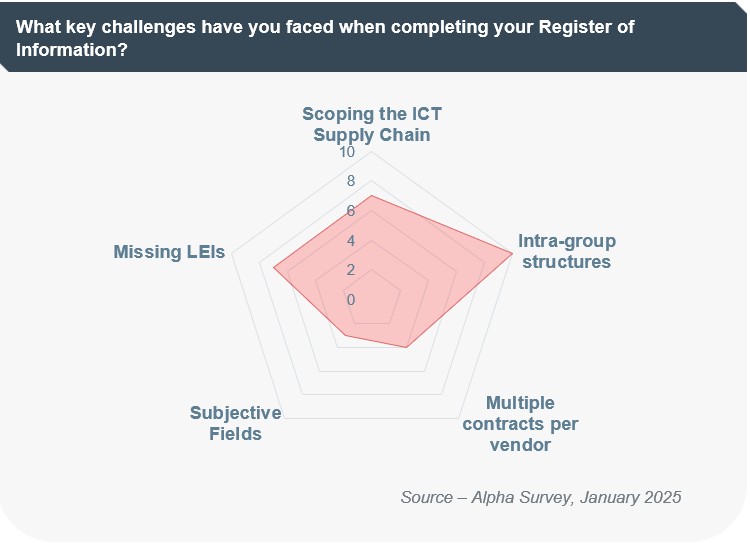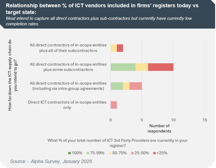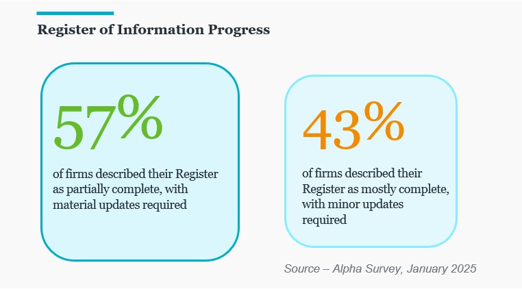 The general sentiment from firms is that while progress has been made, no firm has yet reached a fully complete register. Many have partial registers in place that require significant updates. This is unsurprising given the late publication of European Supervisory Authorities’ (ESAs) amendments and the number of questions raised during recent dry-run exercises